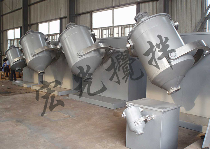 SYH系列三維運動混合機裝料的筒體在主動軸的帶動下,作周而復(fù)始的平移轉(zhuǎn)動和翻滾等復(fù)合運動,促使物料沿著筒體作環(huán)向、徑向和軸向的三向復(fù)合運動,從而實現(xiàn)多種物料的相互流動、擴散、集聚、參雜、達到均勻混合的目的。